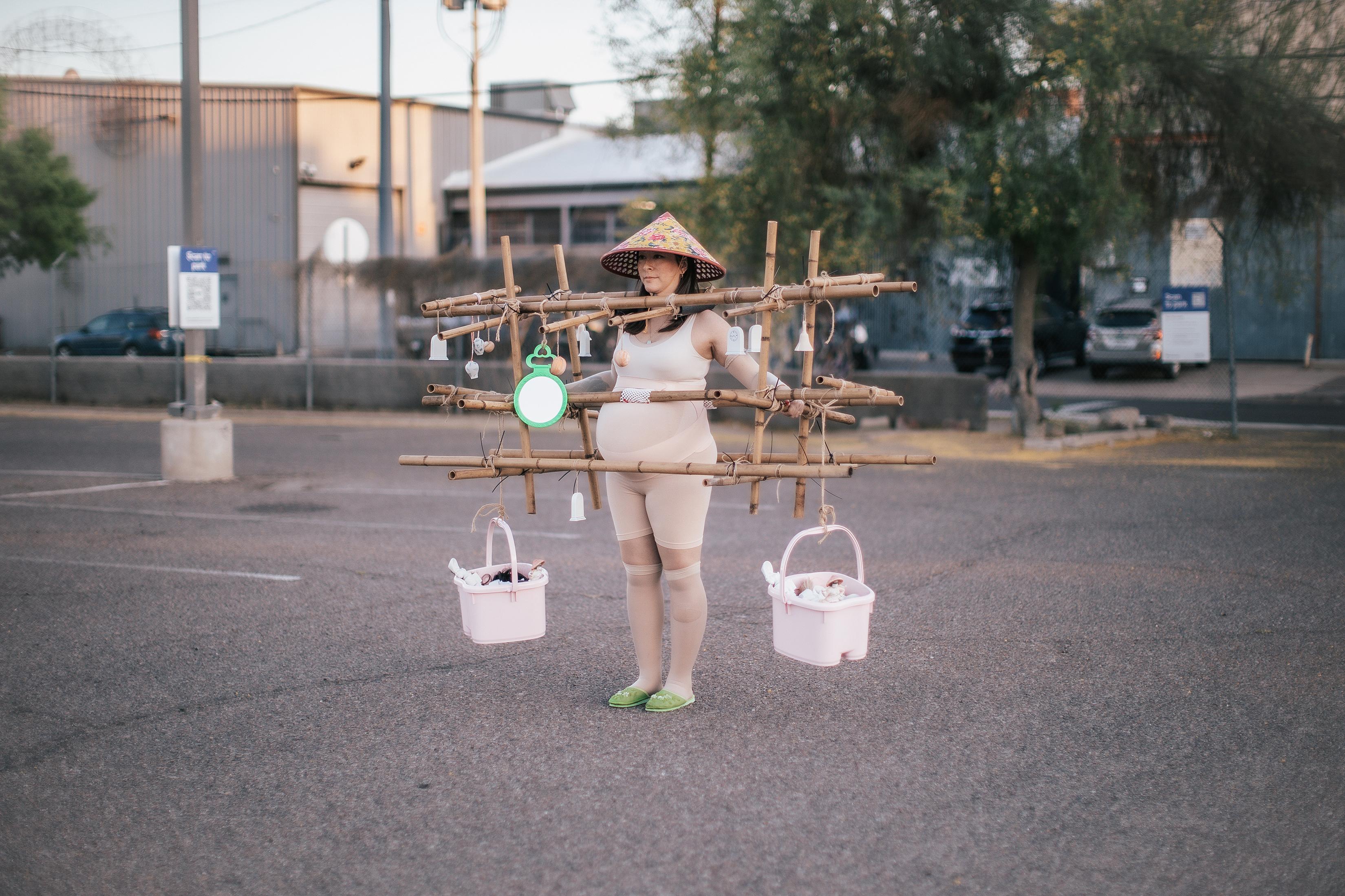 Disrupting the perfect stacks of doormats are golden figurines of a young Asian girl, barefoot, wearing a rice pickers hat, and carrying a heavy load on a shoulder yoke. They become buried under the weight of the mats, hidden and obscured but we know they are there. Her labor and presence invisible to the objects we so easily order and buy but so much a part of this cycle of consumption and fulfillment.